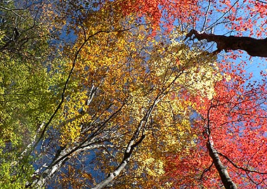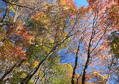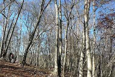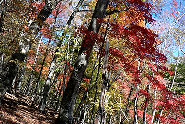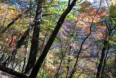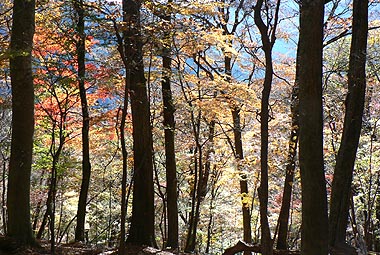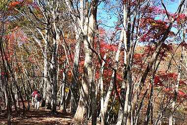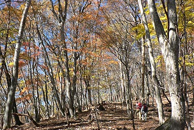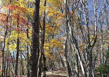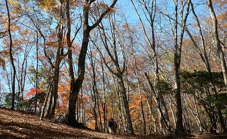 | 登り初めはまだ緑の葉も目につくが一石山からミズナラの巨樹にかけての林は紅葉は盛り。カエデ類の朱色も目立つ。金袋山から先のタワ尾根は登るにつれ落葉が目立ち、空は明るくなってくる。篶坂ノ丸山頂周辺まで登ると完全に落葉している。 タワ尾根はエアリアマップではルートの記載はないが、「巨樹コース」として地元でミズナラまで登山道(周回コース)は整備され、登り初めは急傾斜となるものの道はしっかりしている。金袋山から先も尾根通しに踏跡はあるが、この時期は広い尾根に落葉した葉が積もり、不明瞭な箇所があるが尾根を外さなければ問題ない。 タワ尾根の林の最も素晴らしい部分は末端から人形山周辺までで、新緑や紅葉もこの周辺が最もきれいだ。 |