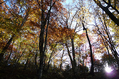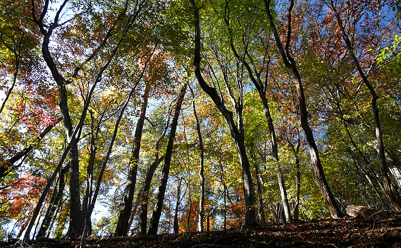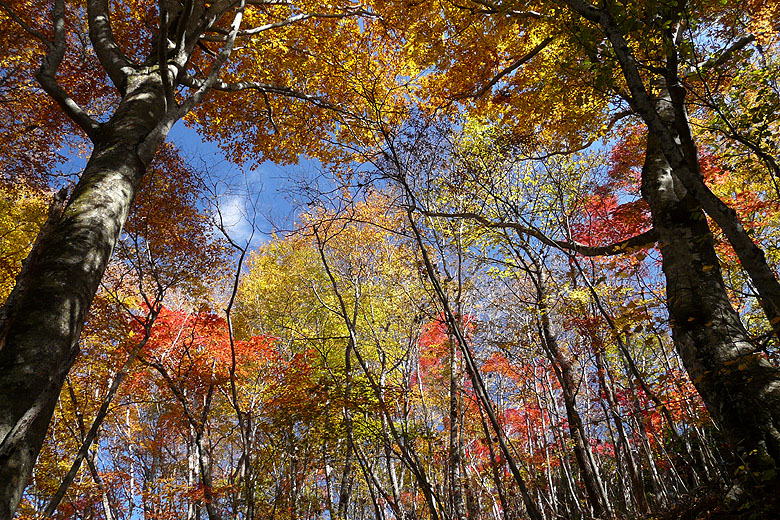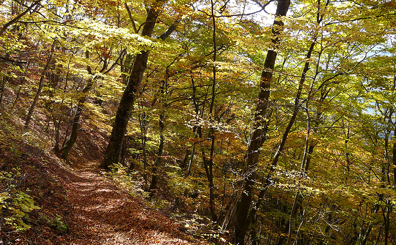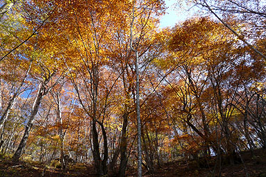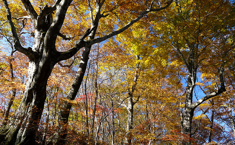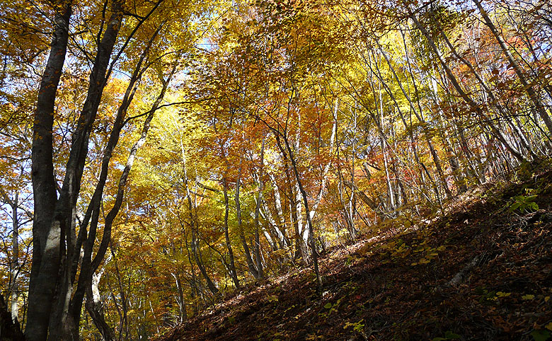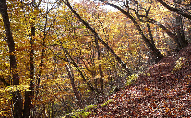 -黄金色に染まる道・染まる空、ブナの森を行く