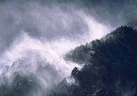 | 木々に積もった雪が、風の強い日には雪煙となって上空に舞い上がります。 冬ならではの情景です。 |