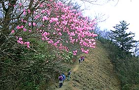 | 4月下旬から5月の上旬にかけ、奥多摩の山々の芽吹きに先立ち、川乗山周辺ではアカヤシオが淡いピンク色の花を咲かせます。 |