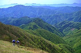 | 5月も中下旬になると奥多摩の山々にも遅い春が訪れます。 展望のよく効く稜線上に立つと、下から緑が駆け上ってくる様子が見てとれます。 |