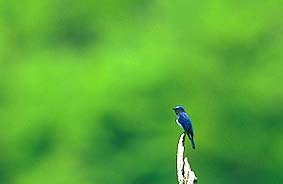 | 木々の芽吹きとともに奥多摩の山野に渡って来た鳥たちは、繁殖の時期を盛んに活動します。 オオルリのオスは、各谷に縄張りを持ち、繁殖相手をさがし、樹上で盛んに囀ります。 奥多摩の春を代表する鳥で、樹の枝の先端や高い梢で囀り、バックの新緑と相まって見事なコントラストを描いています。 |