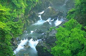 | 雨が降っていると何となく外に出るのが億劫になりますが、雨でなければ出会うことのでき 惣岳渓谷のしだくら橋下流の多摩川は、いくつもの大きな岩が、独特の景観を創り出しています。 雨に濡れた岩肌が、さらに変化を与えています。 |