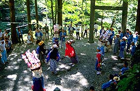 | 8月は奥多摩各地でお祭りのシーズン。 毎週週末になると必ずどこかの集落でお祭りの笛や太鼓の音が響いています。 特に獅子舞が盛んで、今は生活とは直接結び付いていませんが、かつて農耕が生活の糧であった頃は、自然や生活と結び付ついていました。 右写真の日原の獅子舞もかつては雨乞いの意味を含んでいました。 |