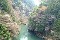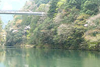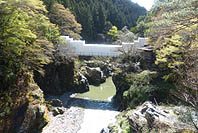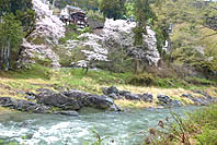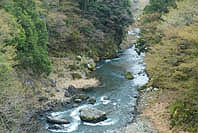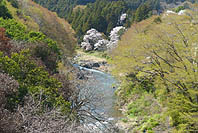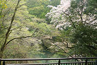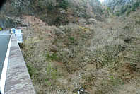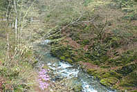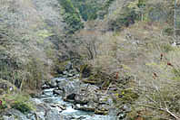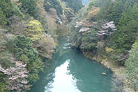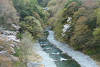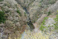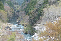 | 数馬峡橋から見る峡谷:ヤマザクラ咲く | 1週前(03/27):芽吹き始め | 峡谷の歩道:芽吹きにヤマザクラ咲く | 上流側から見る峡谷: |