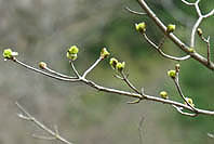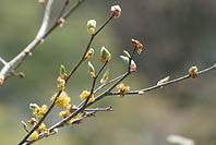 | アブラチャン:街道沿いで花の盛り | キブシ:街道沿いで花の盛り間近 | アブラチャン:川沿いで咲き始め | イタヤカエデ:まだ蕾 |