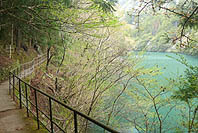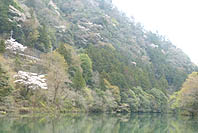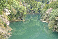 | 数馬峡橋から見る湖面:青濁り | 白丸湖歩道から見る数馬峡橋周辺 | 歩道から見る山肌:ヤマザクラ咲く | 白丸湖畔歩道:低木は芽吹き盛ん |