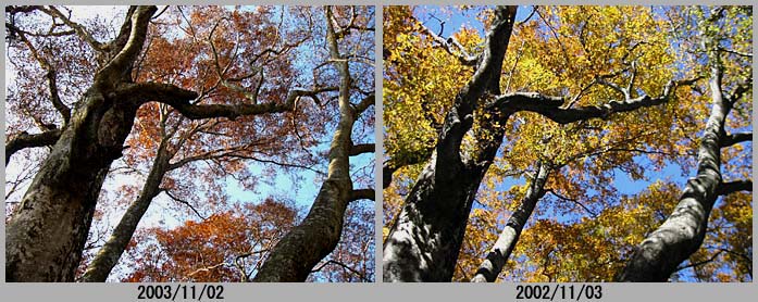 | 下は昨年と今年の紅葉比較(尾根にあるブナ) ・・今年は昨年に紅葉の進みが早く、色彩(全般的に見て)にも冴えが感じられなかった。 | ||||||||||||