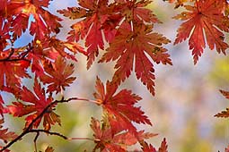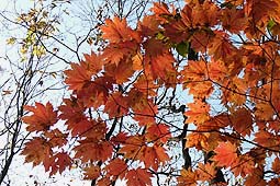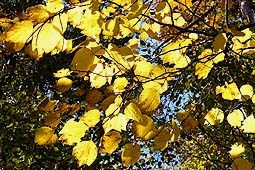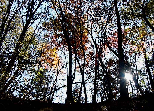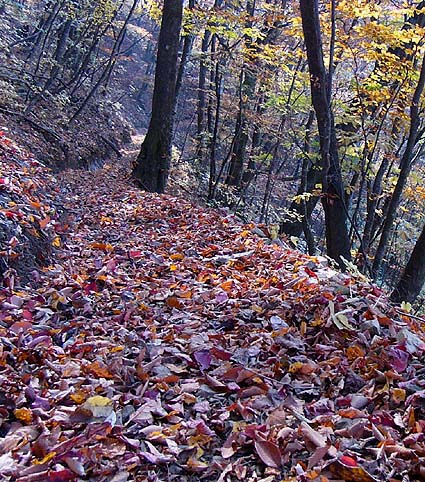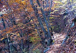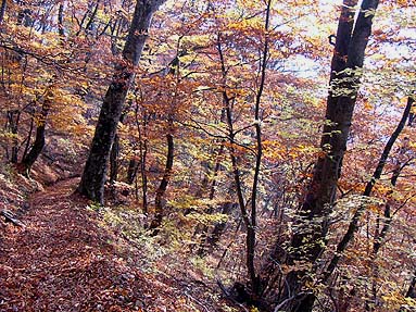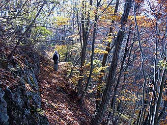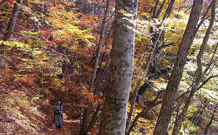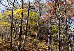 | 小菅村・鶴峠から三頭山へ向かう西へのルートは、途中で神楽入ノ峰を通る尾根ルートと北面の巻き道を経てヌカザス尾根に合流するルートがある。 ここは都民の森から三頭山に至る各ルートの喧噪に較べ、訪れる人は極端に少なく、奥多摩周辺では全域が比較的自然度の高い。 今回は鶴峠から分岐までを取り上げた。ここは午後やや遅く、鶴峠に下ると太陽を正面に見ながらの逆光の道となり、光を浴びて色づいた木々の葉は普段とは違った色彩を演出してくれる。 |