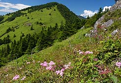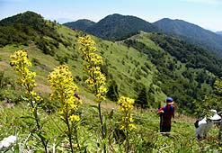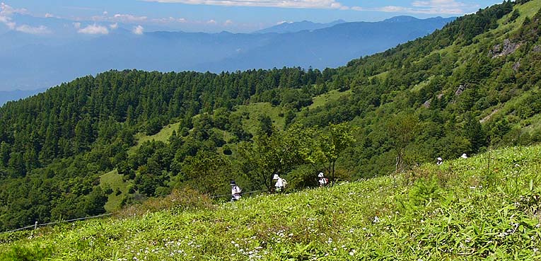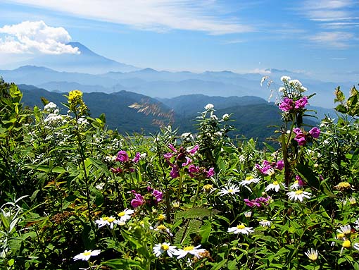 | 大菩薩嶺から介山荘を経て、石丸峠に至る稜線は南面が良く開け、富士山や南アルプスを見ながら稜線漫歩を堪能できる。 夏期はは展望に加え、稜線上はお花畑が広がり、歩く楽しさは倍増する。ひとつひとつの花の名前は知らずとも見ているだけで気持ちも和む。 主稜線そのもののコースタイムはそれ程長くはないので、天候に恵まれた日はのんびり歩きたい尾根だ。 (お花畑に限っていえば、今年は梅雨時期が長く、気温も低い日が続いたため、華やかさは今ひとつだったか。) |