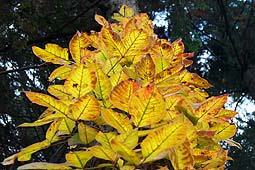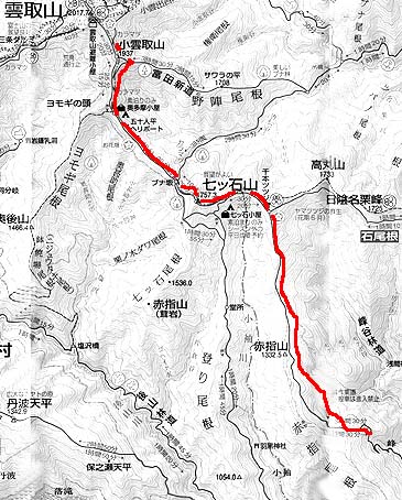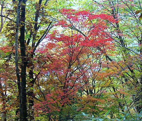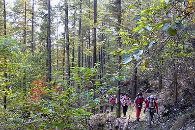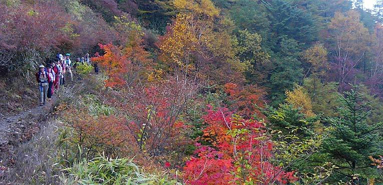 | -雲取山登山教室(10/16-17)の同行記録を兼ね- アカザス尾根は交通の便が悪く、アプローチの長さもあってか利用する登山者も少なく普段は静かな山歩きができる。中腹までは植林帯が多いが尾根に出ると落葉紅葉樹林帯もあり紅葉も楽しめる。 石尾根まで登ると10月中旬には木々の紅葉が始まり、雲取山周辺ではドウダンツツジやカラマツの紅葉が見頃となる。 |
