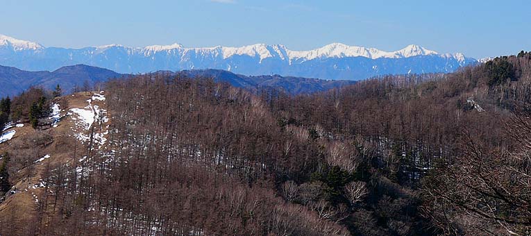 高丸山頂から千本ツツジ(左手前)と奥に南アルプスを見る(一番右は北岳) |