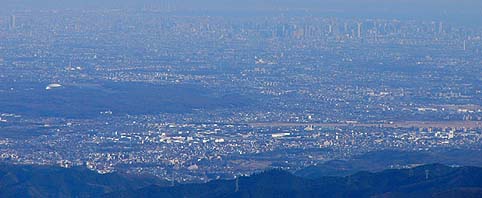 鷹ノ巣山頂から西面の展望(中央は大岳山、右手は御前山。奥は関東平野) |