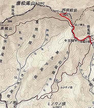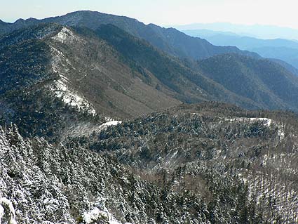 西御殿岩から見る将監峠周辺(最奥は飛竜山)