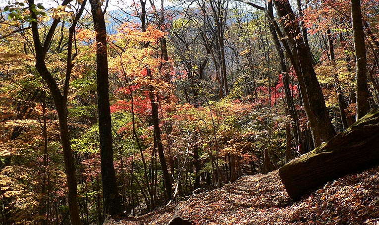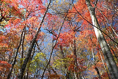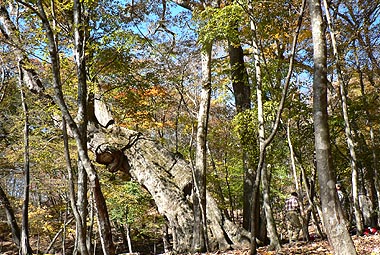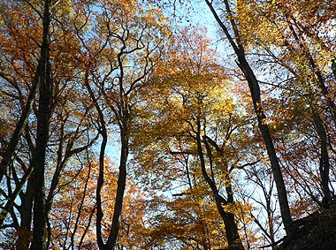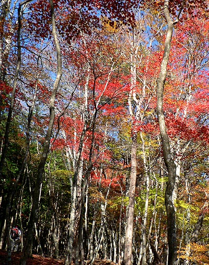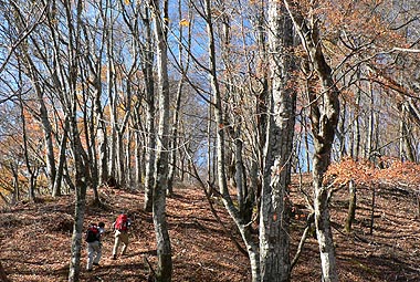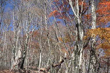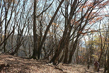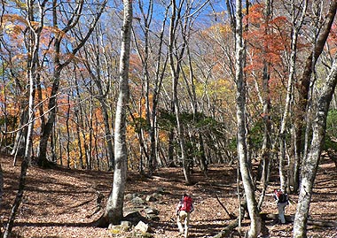 | 登り初めはまだ緑の葉も目につくが一石山からミズナラの巨樹にかけての林は紅葉は盛り。カエデ類の朱色も目立つ。金袋山から先のタワ尾根は登るにつれ落葉が目立ち、空は明るくなってくる。篶坂ノ丸山頂周辺まで登ると完全に落葉している。 タワ尾根はエアリアマップではルートの記載はないが、「巨樹コース」として地元でミズナラまで登山道(周回コース)は整備され、登り初めは急傾斜となるものの道はしっかりしている。金袋山から先も尾根通しに踏跡はあるが、この時期は広い尾根に落葉した葉が積もり、不明瞭な箇所があるが尾根を外さなければ問題ない。 タワ尾根の林の最も素晴らしい部分は末端から人形山周辺までで、新緑や紅葉もこの周辺が最もきれいだ。 |