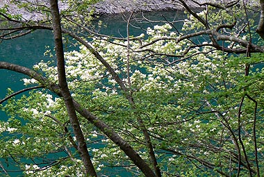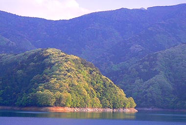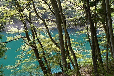 新緑の林と湖面 |