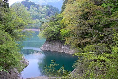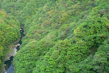 ダム堰堤から見下ろす渓谷 |