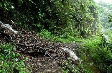 小さな沢筋でも水が流れ出し、土砂を押し出す箇所や、普段は枯れた沢も増水で濁流となっている箇所もある。急斜面に切られた箇所では小さな落石も見られた。