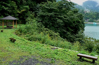 湖畔に出る:左手奥の入り江の一角に山のふるさと村がある |