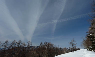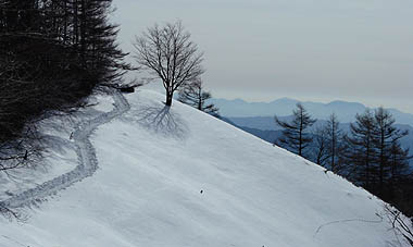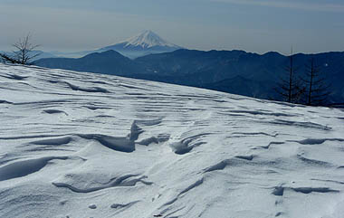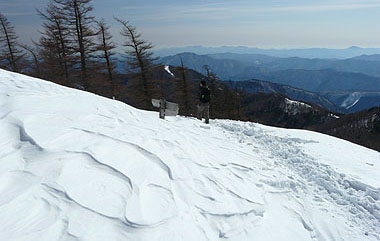 雲取山頂直下の防火帯は微妙な風の影響で雪に模様が出来ている