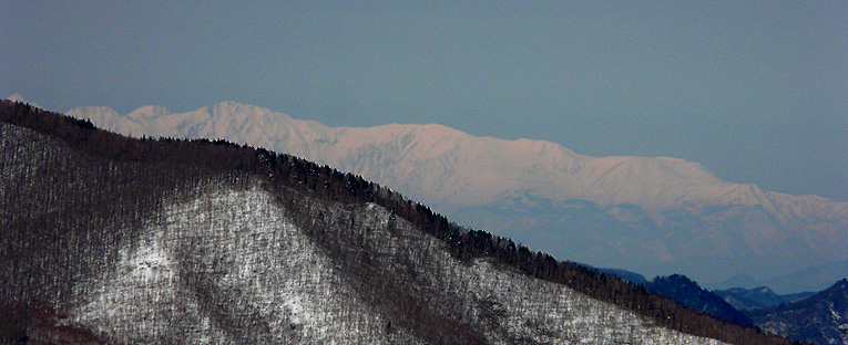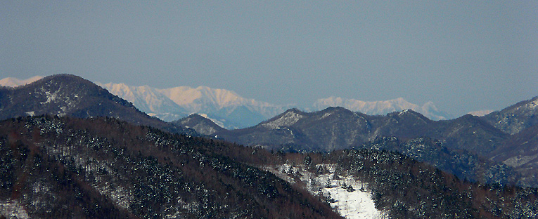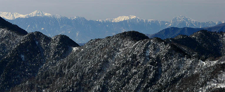 今日は好展望:雲取山頂から見る立山連峰周辺(中央左:薬師岳? 中央右:立山連峰と右脇の尖峰は剣岳)