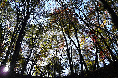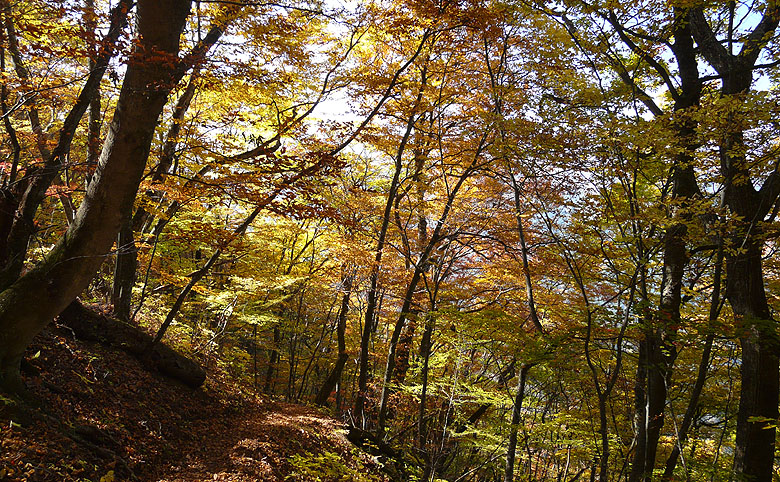 -黄金色に染まる道・染まる空、ブナの森を行く