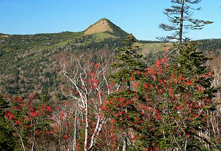 樹間から見る笠ヶ岳 (手前の赤い実はナナカマド) |