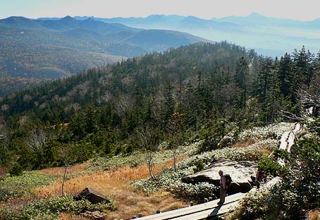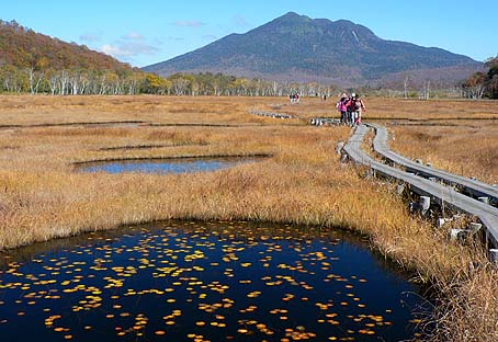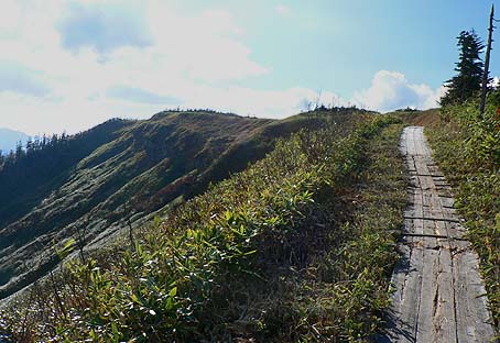 東電小屋からの木道を歩く登山者 (奥の山肌はブナ林となり紅葉も残る) |