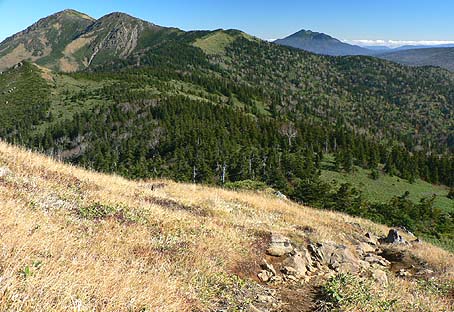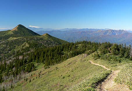 分岐を過ぎると正面奥にアヤメ平が見えてくる (明るく展望の良い道) |