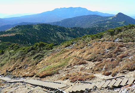 小至仏山へは木の階段が続く (右隅は笠ヶ岳、正面奥は武尊山) |