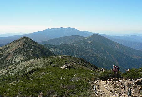 笠ヶ岳分岐先から見る笠ヶ岳 ※この後は正面の針葉樹林帯に入る (笠ヶ岳の右奥は噴煙を上げる浅間山) |