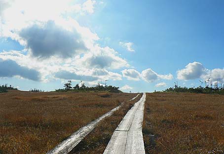 空へと続く?木道にも感じる (アヤメ平先から振り返る) (この後、中原山周辺は樹林帯となる) (中原山からは鳩待峠まで緩やかな下りとなる) |