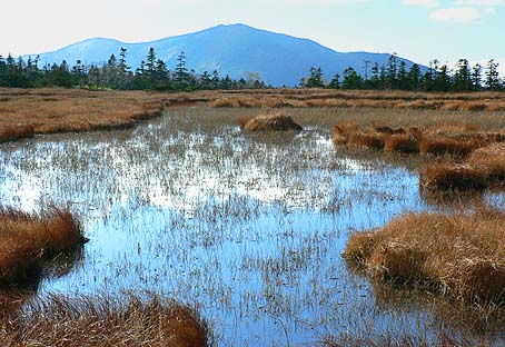アヤメ平から見る燧ヶ岳 (アヤメ平は広く湿原には池塘が点在する) |