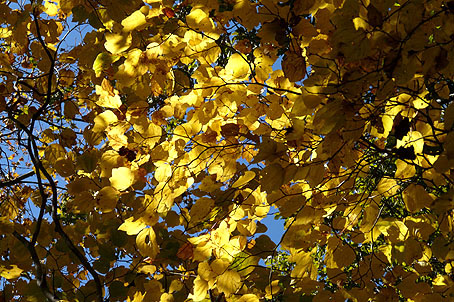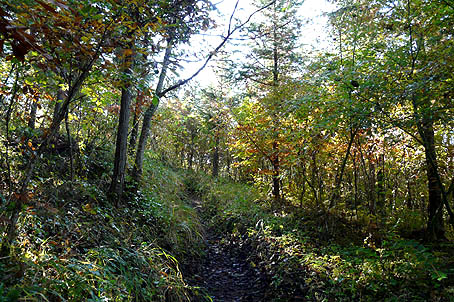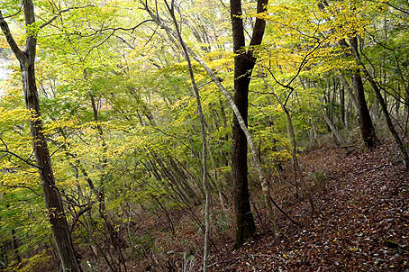 登るにつれ黄葉の林となる (赤系の紅葉はほとんど見ない) |