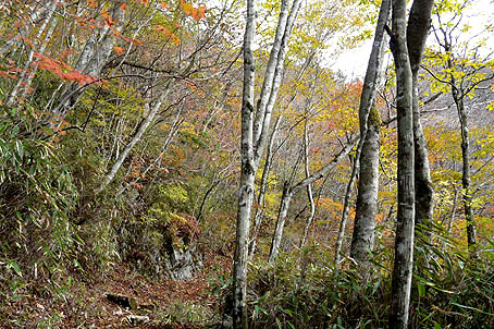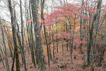 ブナ林の下まで降りると散り際の紅葉となる |