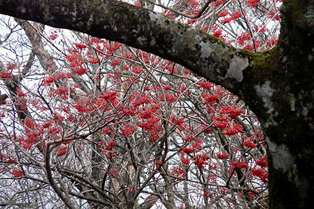 冬木立の中でナナカマドの赤い実が目立つ |