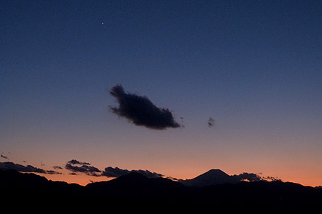 小仏城山山頂から見る富士(17:20頃) (暗くなるに連れ、富士山左上の金星が輝きを増す) |