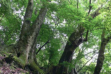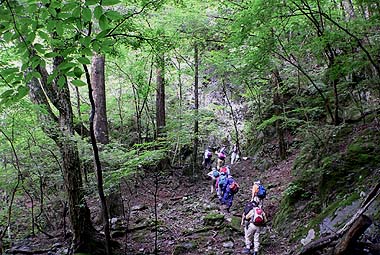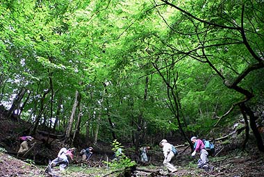 [概要] :日原地区は巨樹の多い地域として最近脚光を浴び、幹回り3mを越える大木が800本を越えると言われる。なかでも金袋山のミズナラは大きく、ここを主に巨樹コースが近年整備され、登り始めと終わりは相当な急傾斜だが、途中は歩きやすくなっている。コースの途中にも大木が多く、また周囲は深い落葉広葉樹が多くを占めている。