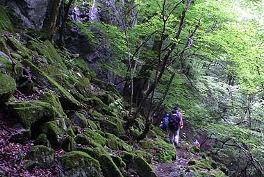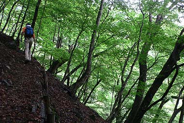 深い樹林帯の斜面を行く |