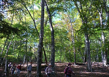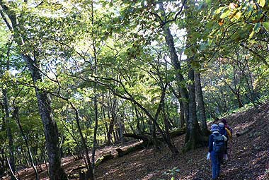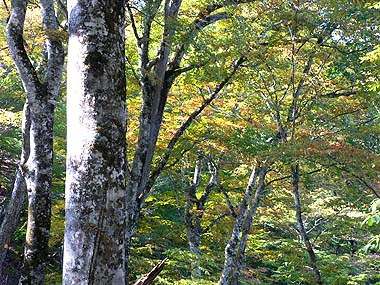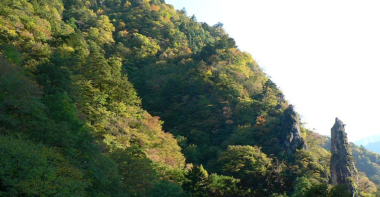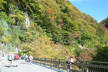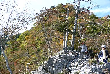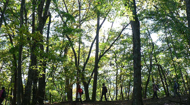 | コース:小川谷林道→[人形尾根]→金袋山→ミズナラの巨樹→一石山→籠岩→[巨樹コース]→日原鍾乳洞先登山口 [概要] :日原周辺は自然度が高く、落葉広葉樹林帯も多く、新緑や紅葉は東京でも最も鮮やかな地域。今回のコースは紅葉に加え、巨樹も多く、なかでも金袋山のミズナラは大きく、ここを主に巨樹コースが近年整備された。登り始めと終わりは相当な急傾斜だが、途中は歩きやすくなっている。コースの途中にも大木が多く、またこの山域もコースは深い落葉広葉樹が多くを占めている。 巨樹コースを中心としながら、登りは人形尾根と周辺の山道を使い金袋山とミズナラの巨樹、籠岩を巡る。 紅葉は例年なら盛りの時期となるが、今年は残念ながら紅葉は始まったばかりで、上部の樹林帯でもまだ緑の葉が目についた。 タイム:東日原/9:55→10:45/小川谷林道入山口→12:30/金袋山/13:00→13:20/ミズナラの巨樹→13:40/籠岩→14:50/小川谷橋バス停 [天候/晴] [メンバー/17名] [歩数/約19,500歩] |