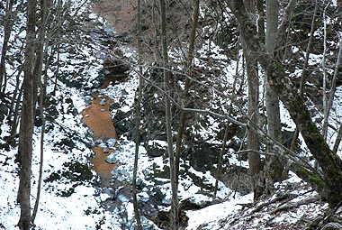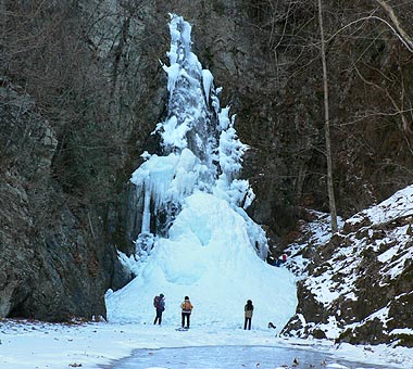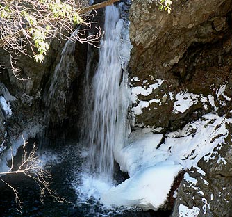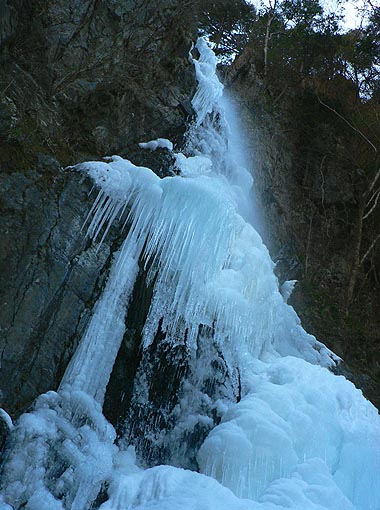 | [概要] :前年師走から1月中旬まで寒い日が続き、全面氷結一歩手前まで行ったが中旬に3月下旬頃の暖かい日があり、一時ほとんど氷結は無くなってしまっった。その後寒さが戻り再び凍り始めたが、この日で百尋ノ滝は50%くらいか。 海沢谷の三滝は一部表面に流れる箇所が見られるものの、かなり氷結は盛り返していた。 |