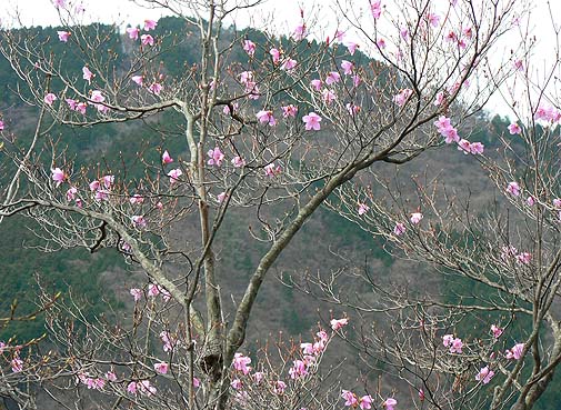 尾根下部まで低木は芽吹き・ミツバツツジは花の盛り |