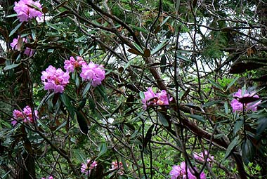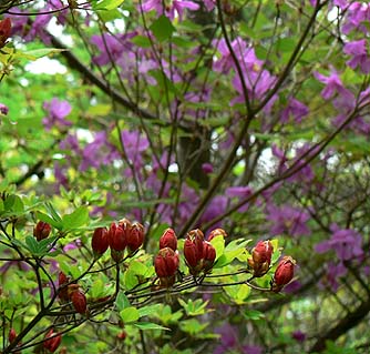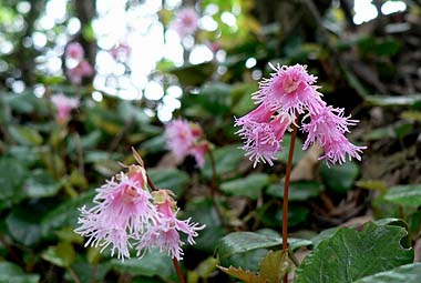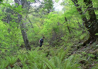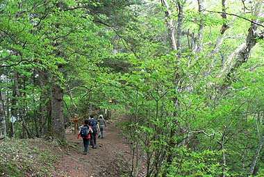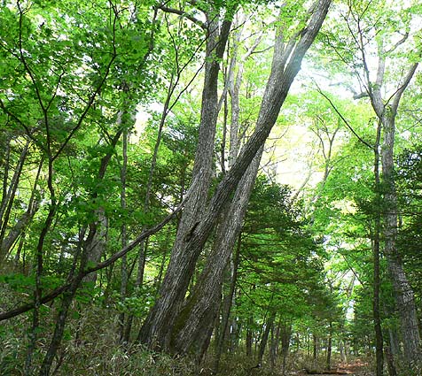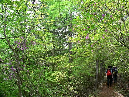 | [概要] :新横手峠まで林道を車で入る。ここからは横手峠も近い。周辺はほとんど樹林帯の中で黒川山の展望岩を除けば展望はないが、アップダウンは少なく歩きやすい道が多い。 鶏冠山だけは岩場を交えた登りとなり、周囲にはアズマシャクナゲやイワカガミも見られる。アズマシャクナゲは今年は花の付きがあまりよくなさそうだ。 北面の道はシダ類も繁茂し、林床では亜高山帯の日陰を好む花が何種か見られた。 |