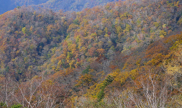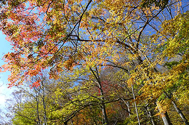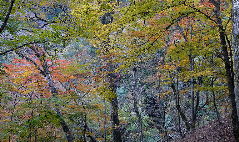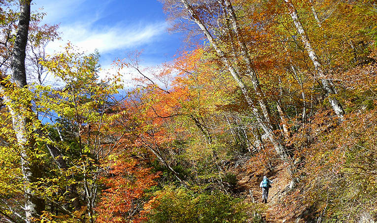 | コース:日原林道・唐松谷登山口/9:00→[唐松谷]→ブナ坂→12/25雲取山13:05→[富田新道]→唐松谷合流点→15:25/唐松谷登山口 [天候/晴・稜線に出る頃から曇り] [メンバー/5名] [歩数/約27,400歩] [歩行時間/9:00-15:25] ※秋のオフ会(10/27の1週順延) [概要] :紅葉盛りの唐松谷を行く。ほんとに色彩豊かな谷、下の画像を見ていただけば紅葉の状況に説明はいらないだろう。 ブナ坂から石尾根ではカラマツの紅葉が終わる前のくすんだ黄葉が残るくらいで、他の木々の紅葉はさすがにほぼ終わっていた。 富田新道に入ると上部はシカの食害の影響で黒木の立ち枯れが増え、年々明るくなりかつての鬱蒼とした面影はなくなってしまった。中腹以下では紅葉が盛りだったが、雲ってしまったのが少し残念だった。 |