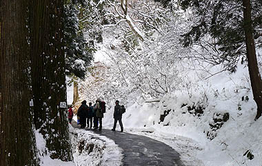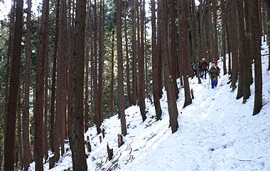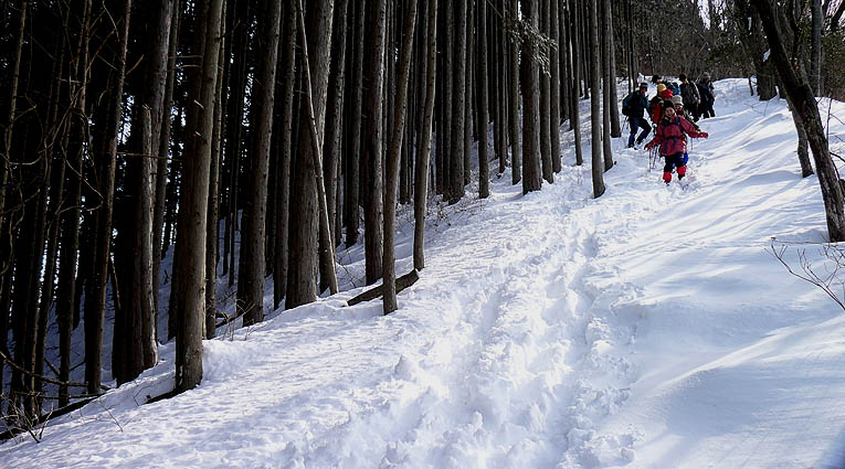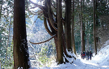| [概要] :前日御岳周辺では10cmくらいの積雪があり、新雪の山行きとなった。 表参道は御岳山に住む人達により除雪されている最中で雪のない場所もかなりあった。除雪されていない場所では15cm前後の積雪があるが、かえって除雪された坂道の方が滑って歩きにくい。御岳山周辺では30cmを越える積雪の場所が多いが人が歩く幅は除雪されている。 大塚山周辺は南側と北側や尾根で積雪が異なり、北側や尾根筋では40cmを越える箇所もあるが、全域でトレースはしっかりし、まだアイスバーンもなく今が最も歩きやす状態と言えそうだ。大塚山から植林帯に入り下るに連れ積雪は減り、下部ではほとんどなくなる。雪は水気を帯びかえって歩きにくくなる。 |
