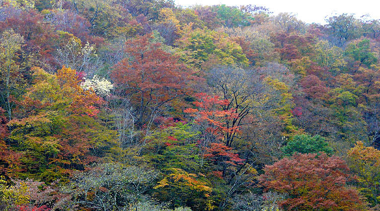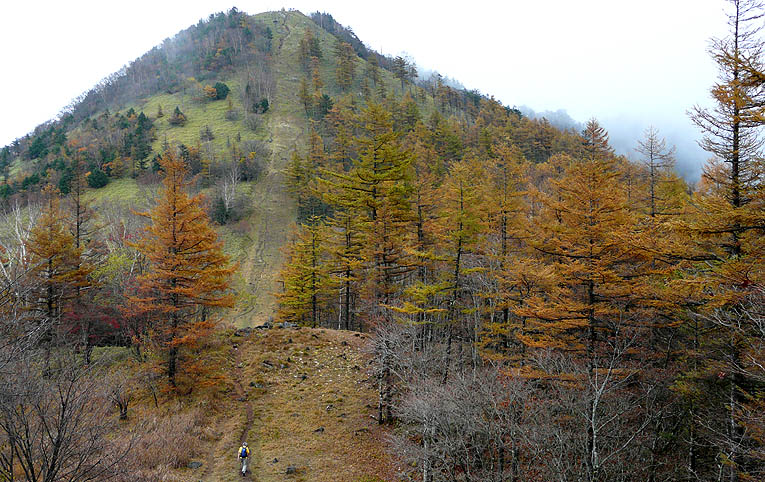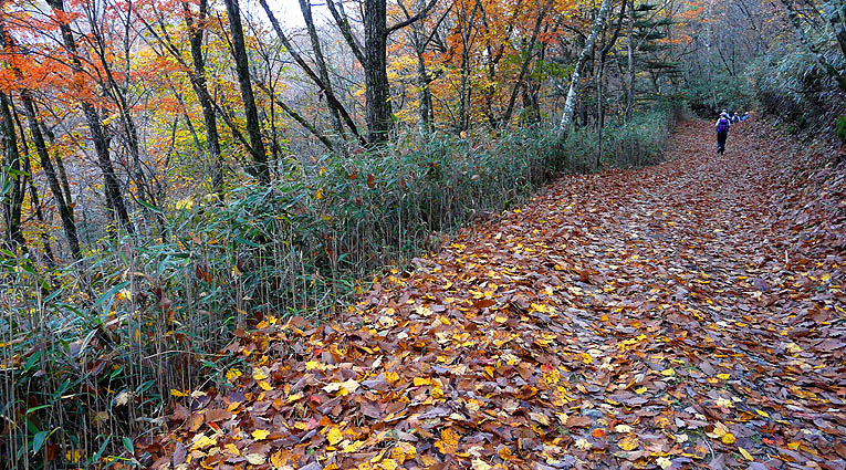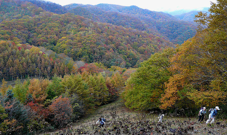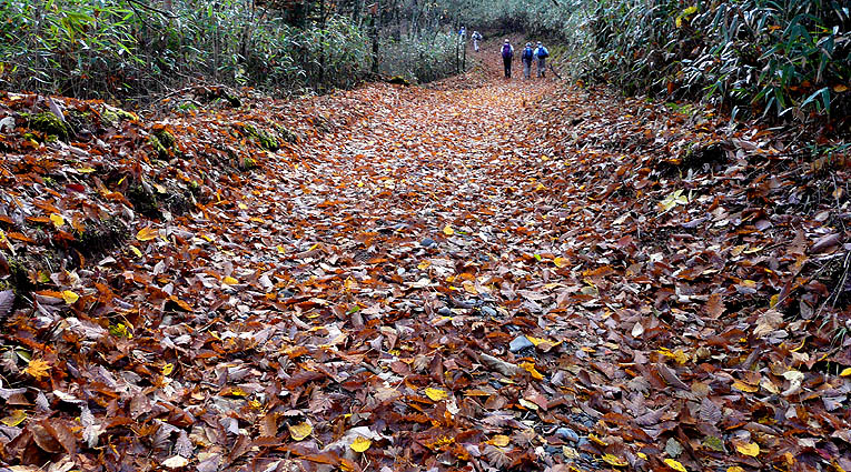 | コース&タイム:作場平/9:20→[ヤブ沢]→10:20/ヤブ沢峠/10:25→1120/笠取山→11:55/笠取小屋/12:25→[斉木林道]→14:55/石保戸山→指入峠→15:10/犬切峠→[一ノ瀬林道]→15:55/作場平 [天候/曇・防火帯では時折淡い薄日が射す] [メンバー/8名] [歩数/約33,500歩] [歩行時間/9:20-15:55] ※秋のオフ会 [概要] :作場平登山口からほぼ全域で紅葉の盛り。笠取草原付近や斉木林道のカラマツは黄葉。ただ笠取山頂付近や稜線のツツジ類はほぼ落葉。斉木林道は落ち葉溜まりの道も多く上を見ても下を見ても紅葉で彩られる。石保戸山からの防火帯も紅葉は盛りではあったが、欲を言えばもう少し日差しが欲しかった。花を見るのはさすがにごく僅かになった。 |