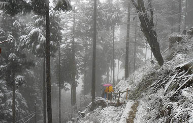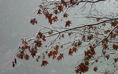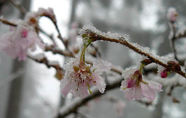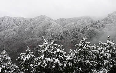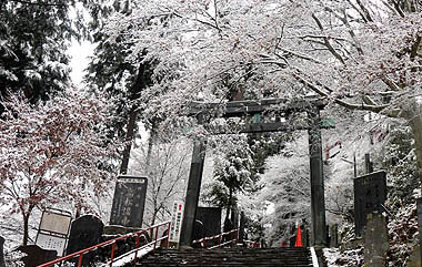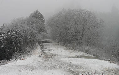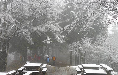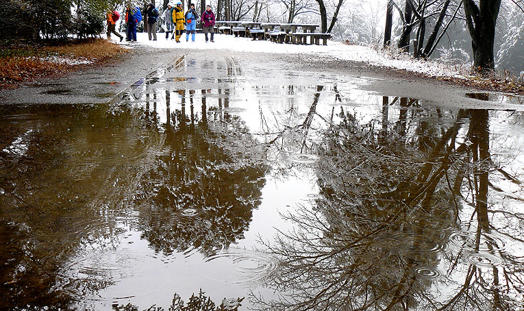 雪降る中のオフ会となった。御岳山周辺の積雪は2cmくらい、午後は止んだ