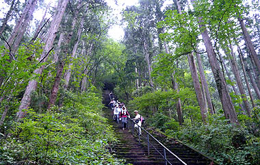 愛宕山下の(名物)階段:傾斜は全体でもきついが上部ほどきつくなる |