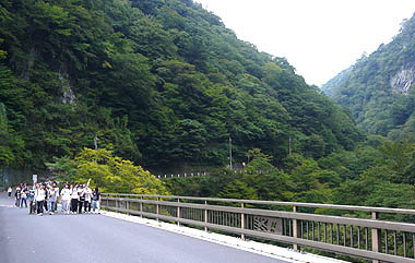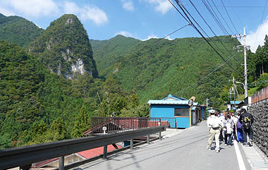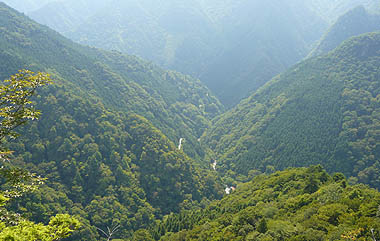 燕岩の頭へから日原の谷筋を見る:白い線は日原街道