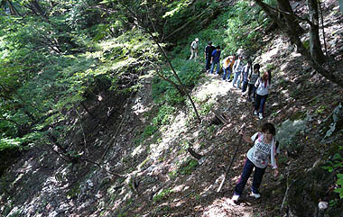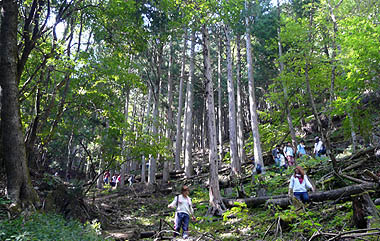 日原鍾乳洞先の登山口:しばらくは沢筋の急坂を登る